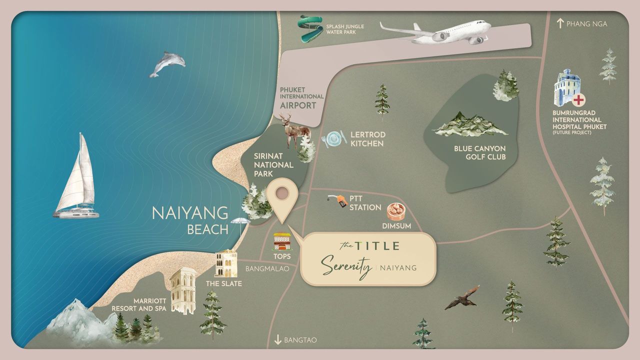 The Title Serenity Naiyang is located in the northwest part of Phuket, next to Naiyang Beach and Sirinat National Park. This is one of the most peaceful and green areas of the island with developed infrastructure. The international airport is only 10 minutes away. Convenient transport accessibility is combined with a secluded atmosphere. Cafes, shops, medical institutions and educational centers are located nearby, which makes the location attractive for living and investment.