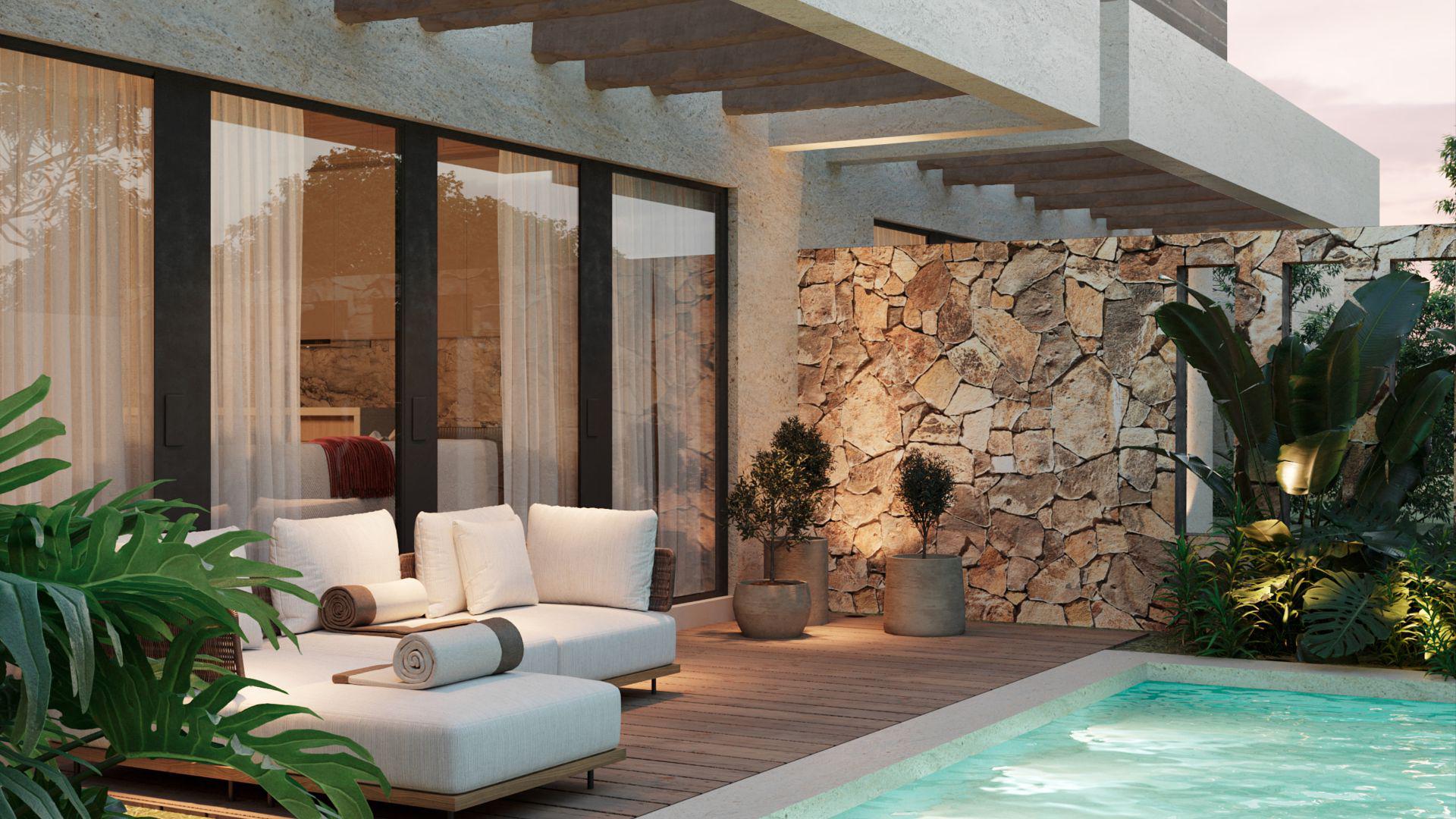 These spacious two-level townhouses feature 3 bedrooms and 3.5 bathrooms, designed with an open floor plan to maximize light and space. Thoughtful finishes and modern touches, including an optional private pool and tropical garden, make every day feel like a resort getaway. Each home is equipped with the latest Amazon Alexa Smart Home system, providing WiFi connectivity, smart locks, and a video doorbell for enhanced security and convenience. Enjoy the comfort of parking for two vehicles and the luxury of customizing your space to suit your lifestyle. Furniture packages are available for purchase so your home can be ready to use at handover!