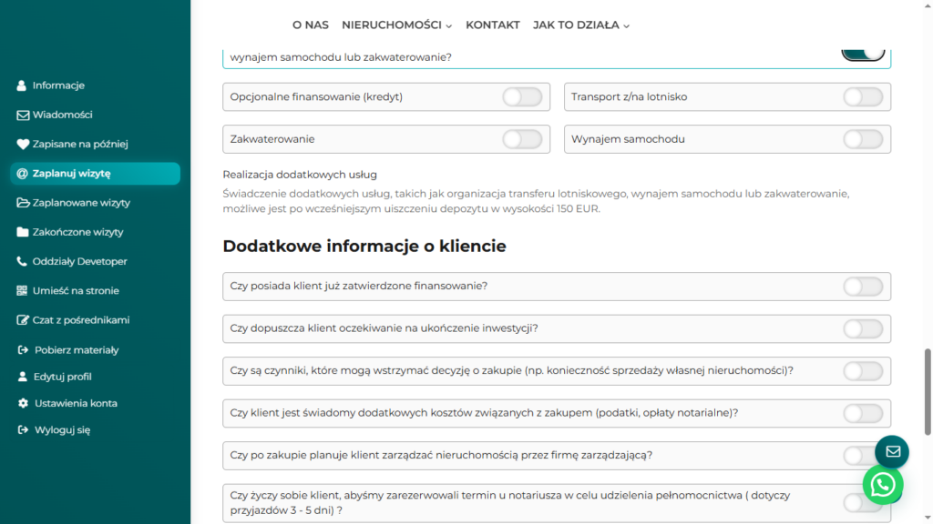 Dalsza część formularza zawiera pytania, które pomagają pośrednikowi precyzyjnie określić potrzeby i preferencje klienta dotyczące nieruchomości.